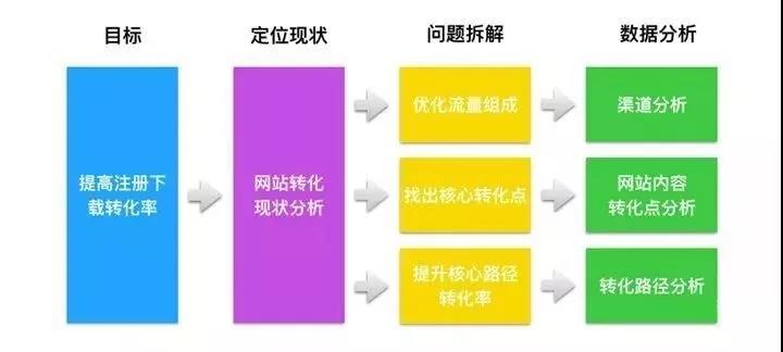 采用線上營銷的方式,獲取的用戶最終落在我們網站或者 APP上,我們的轉化目標是讓新用戶注冊或者下載。