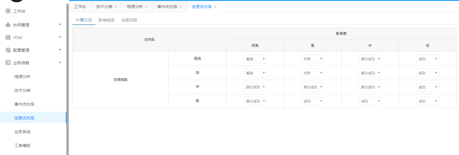 變更優(yōu)先級,表明了變更的優(yōu)先程度,包括極高、高、中、低等,并各有相對應(yīng)的處理完成度。這樣使得變更的安排能夠快速、高效。同時對于變更可能出現(xiàn)的故障也能夠提前預(yù)知、預(yù)防、預(yù)警。并快速定位問題所在,相應(yīng)處理。