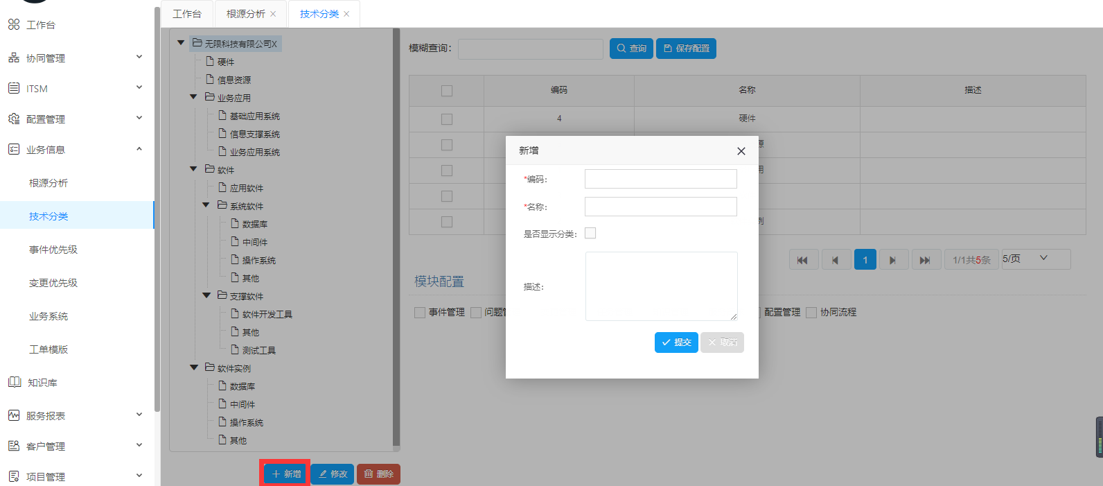 技術(shù)分類主要是對于公司所用的軟硬件系統(tǒng)做出分類,便于細(xì)化管理。并且包含模塊配置以及模糊查詢。可以快速、精準(zhǔn)的查詢相對應(yīng)的模塊。