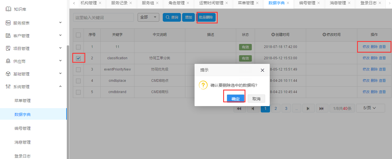選中目錄,點(diǎn)擊右側(cè)的功能按鈕,可以對(duì)字典進(jìn)行查看、修改、刪除以及批量刪除等操作。