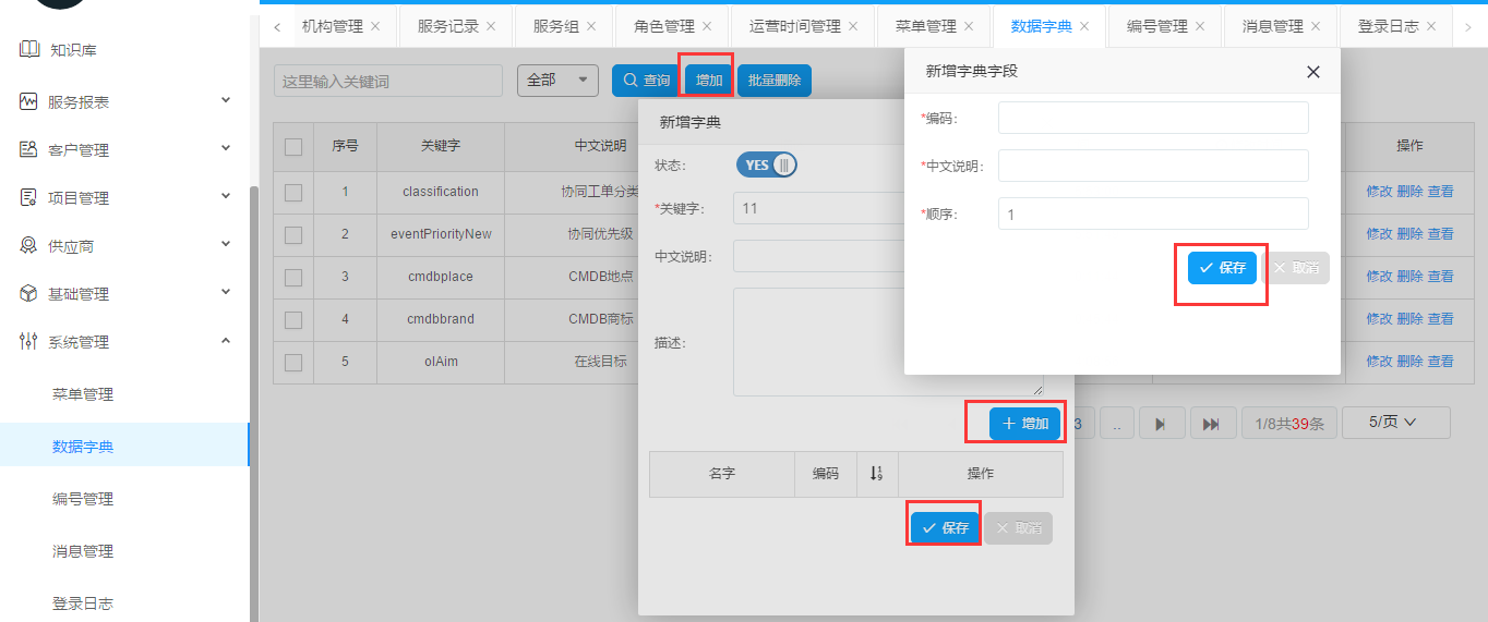 點(diǎn)擊增加按鈕,新增字典字段,填寫(xiě)完成點(diǎn)擊“保存”即可