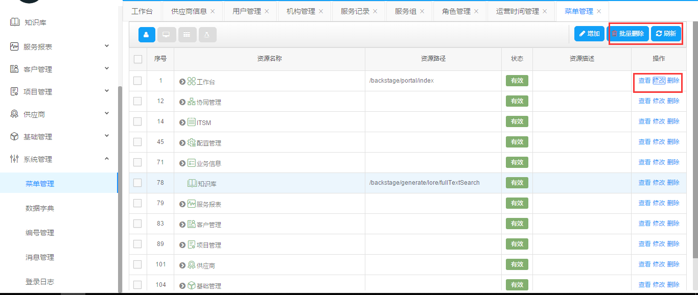 選中目錄,點(diǎn)擊右側(cè)的功能按鈕,可以對(duì)菜單進(jìn)行查看、修改、刪除以及批量刪除等操作
