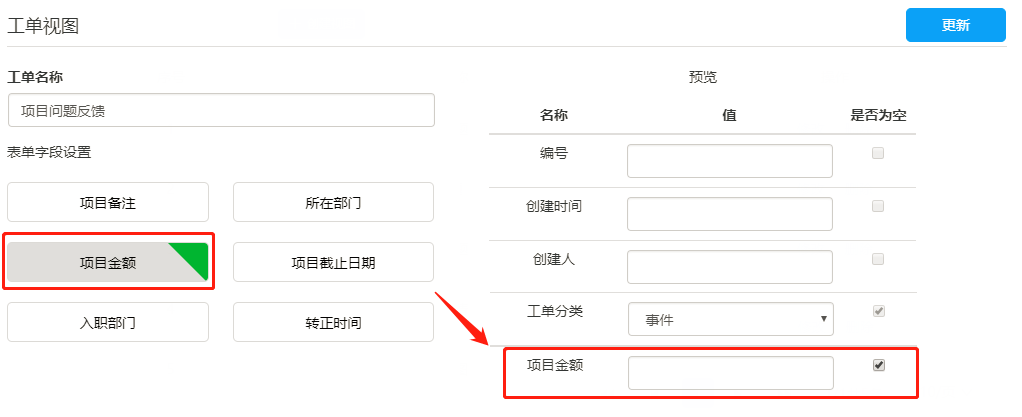 從左側工單視圖依次選中表單字段,在右側配置是否必填,點擊右上角更新,保存視圖生效。