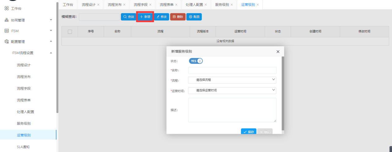 服務級別即為服務級別可申請的工單模板,以流程和運營時間為基礎新增條目。點擊新增。彈出對話框后,填寫名稱,選擇類型、運營時間和流程,您也 可以上傳顯示識別,適當描述一下該條目。如果確認點擊提交,放棄點擊取消。