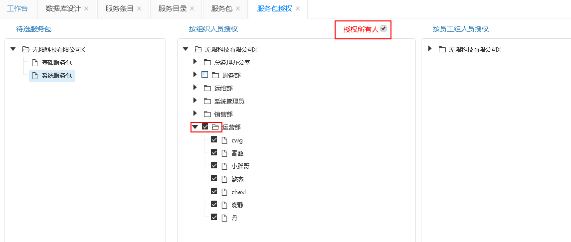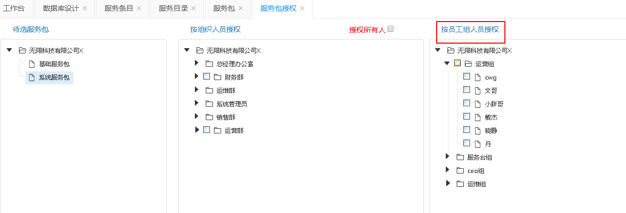 在按組織人員授權模塊中通過公司機構的加載樹選擇員工,或者通過勾選父節點選中其下所有員工。這里,我們系統提供了一個便捷操作,即勾選授權所有人就能將服務包授權給公司里所有人