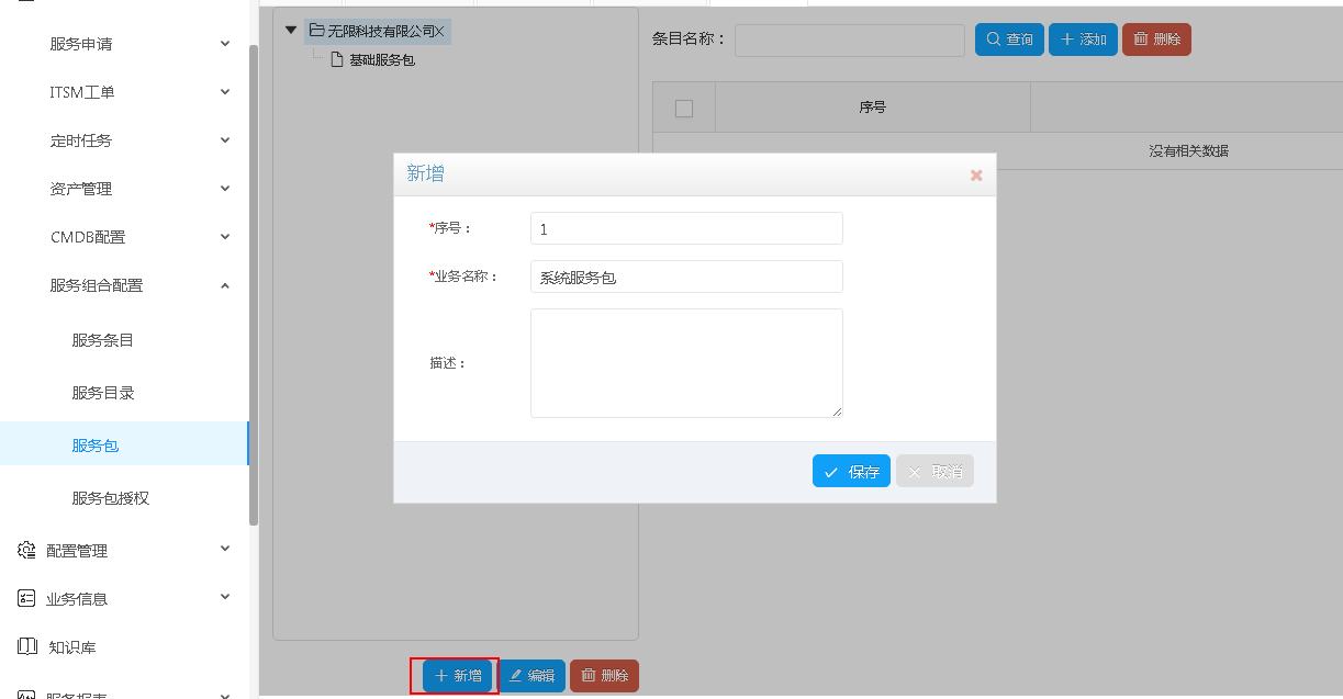 選擇一個節點,點擊新增。彈出對話框后,填寫序號和業務名稱,您也可以適當描述一下該服務包,點擊保存