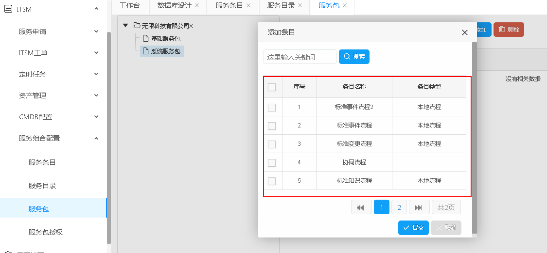 選擇一個服務包,在右邊列表處點擊新增。彈出對話框之后選擇服務條目,添加條目之后才可以走相應的流程,選擇之后點擊提交。