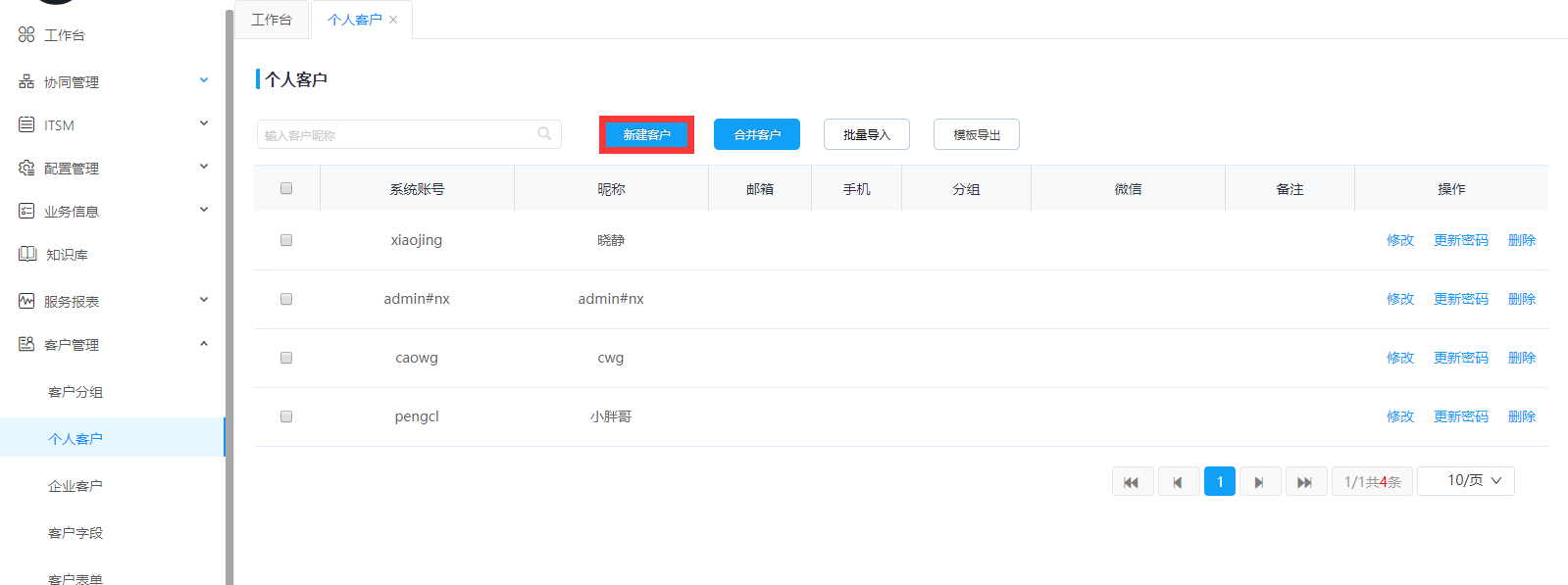企業(yè)客戶(hù)主要是對(duì)企業(yè)客戶(hù)的賬號(hào)信息的設(shè)置管理。可以設(shè)置賬號(hào),昵稱(chēng),郵箱,手機(jī),分組,微信等,并可以進(jìn)行修改密碼,移除用戶(hù)等操作。