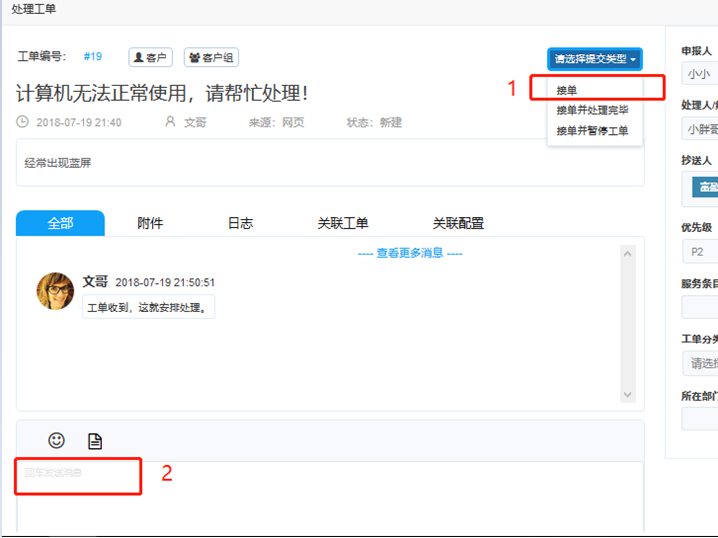 通常情況下,點(diǎn)擊接單后,在消息框內(nèi)反饋處理進(jìn)度即可。