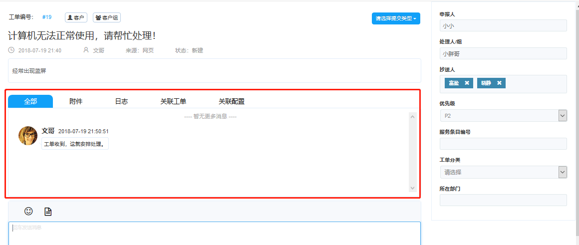 消息區(qū):工單詳情下側(cè)為消息區(qū),輸入消息實(shí)時(shí)溝通。