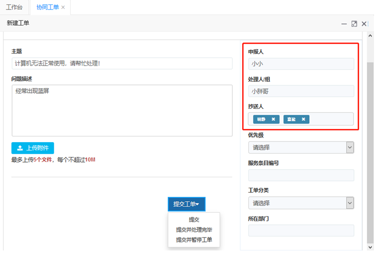 抄送人:將工單抄送給某些人,被抄送人可以參與工單的處理,隨時(shí)了解到工單的進(jìn)度。