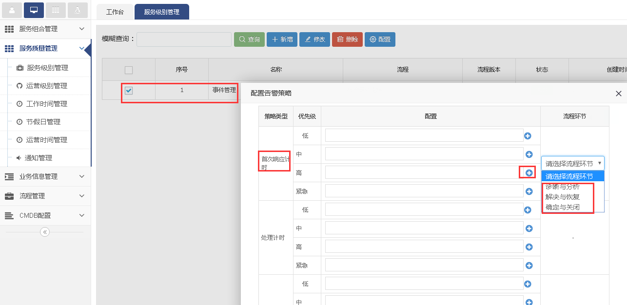 首次響應計時,流程環節需要選擇,然后根據事件的優先級選擇右側‘+’,進行通知信息填寫。
