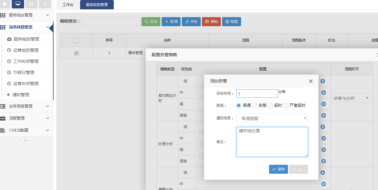 點擊新增。彈出對話框后,填寫名稱(如事件管理),在 流程的下拉框中選擇流程(如事件流程),可適當填寫描述,點擊保存。*頁面中的yes代表設置的這個服務級別生效。