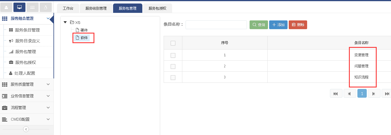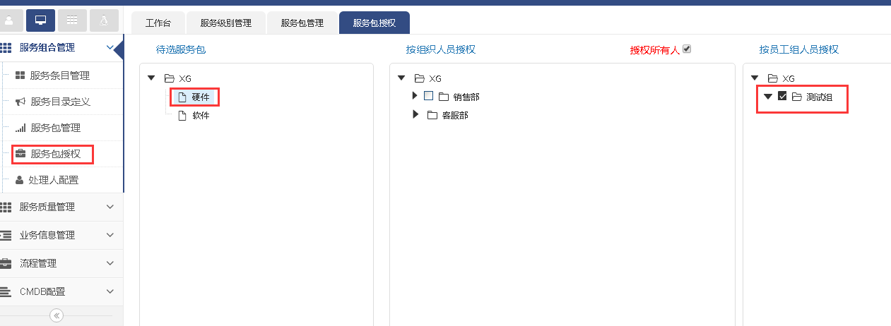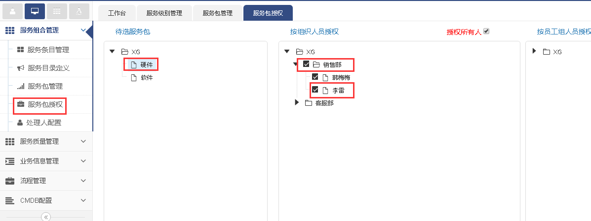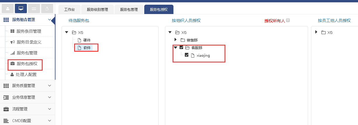 軟件這個服務包里包含了三個流程(變更管理,問題管理,知識管理),然后我們對軟件服務包進行授權,我們授權給客服部xiaojing這個部門成員