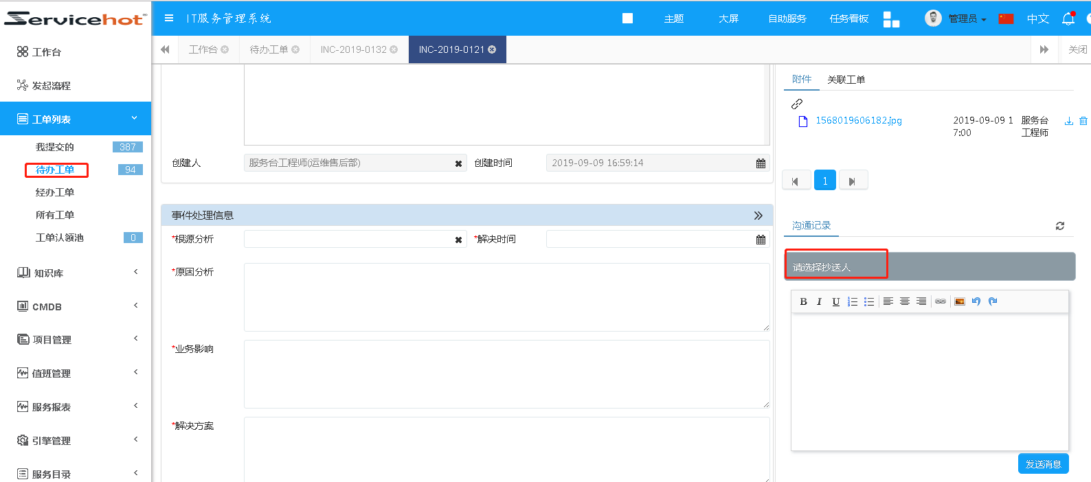 配置方法:工程師找到自己的待辦工單,便可進行在線溝通,選擇抄送人等操作。