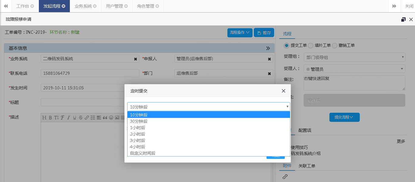 有些工單需要在指定時間才能提交,比如變更工單要在變更前才能提交,可以提前把頁面信息填好,時間設(shè)置好便會定時觸發(fā)執(zhí)行。