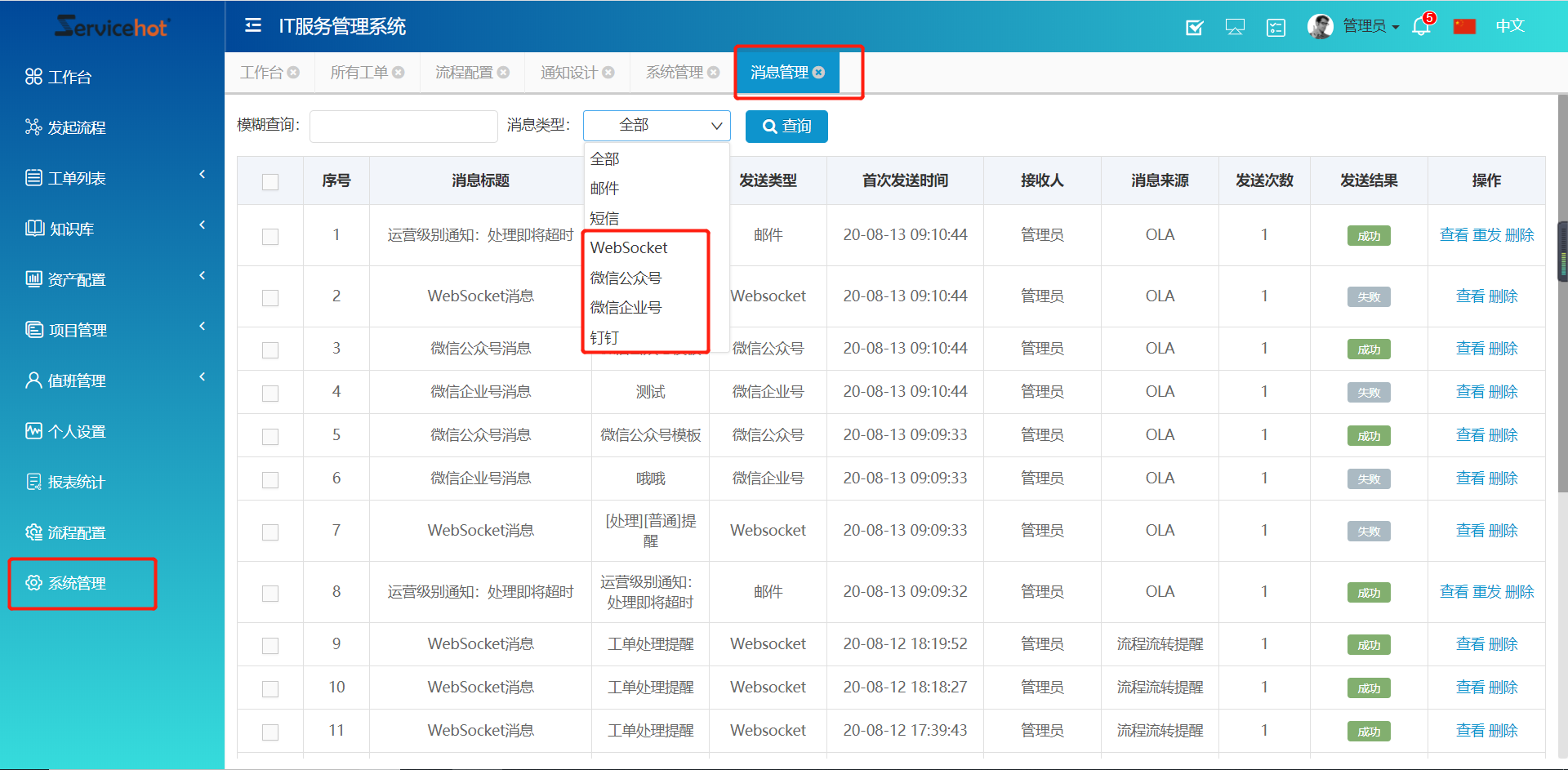 系統新增消息提醒方式,可通過郵件、短信、WebSocket、微信公眾號、微信企業號、釘釘等六種方式對用戶進行消息提醒,更加多元化,符合不同企業需求。