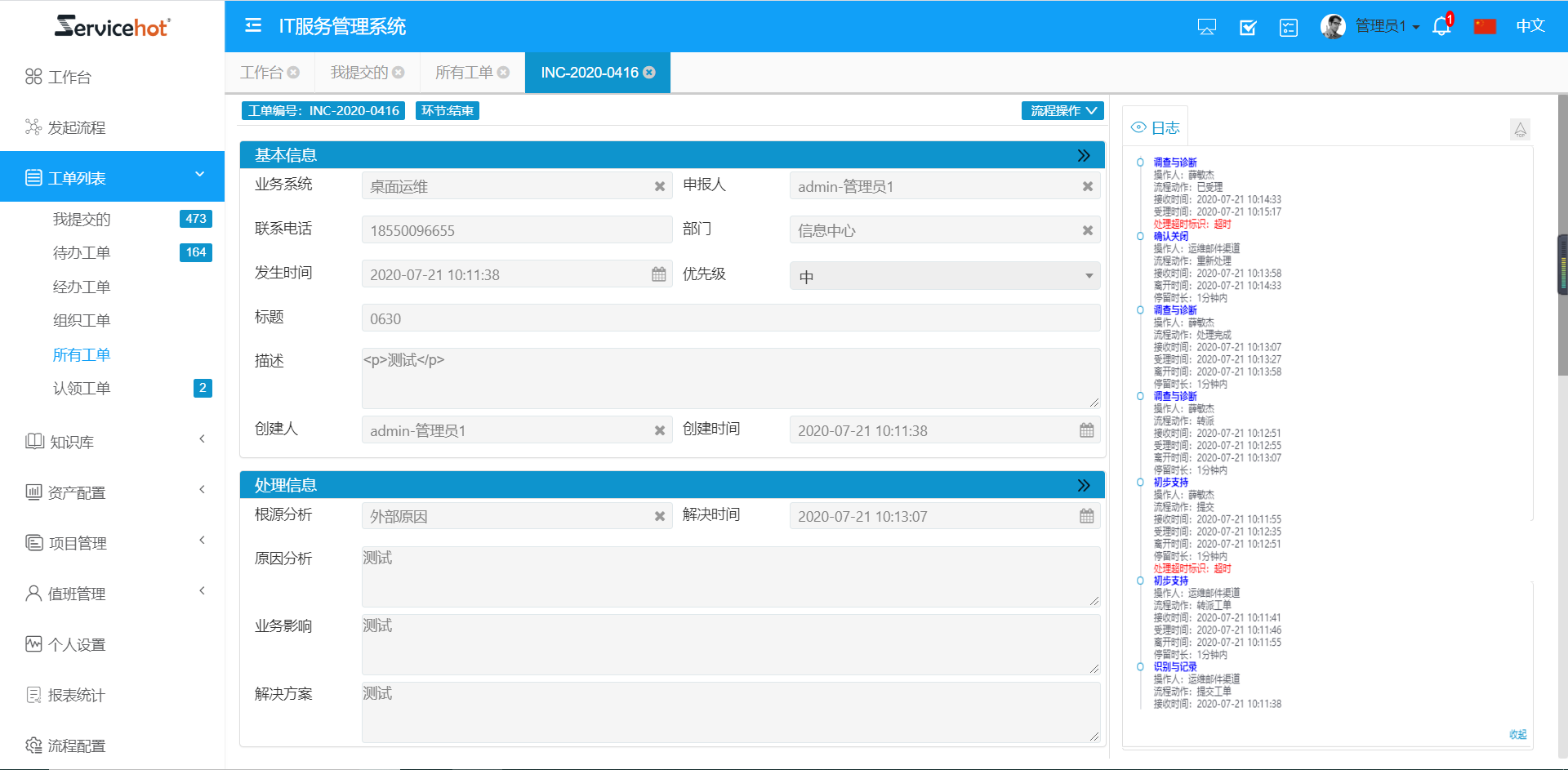 工單提交后可查看日志,記錄工單從提交到處理再到結(jié)束的全過程。每一個節(jié)點的處理人、流程動作以及接收時間都可追溯。