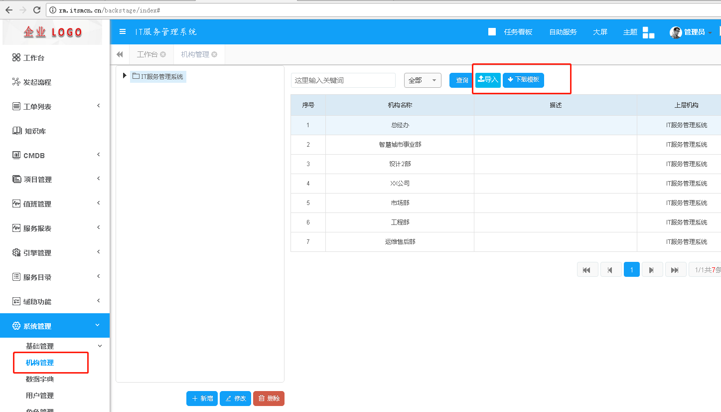 2. 組織機構新增導入功能,您可以先下載模板,按照模板填寫完整之后便可以將信息一次導入系統內,也節約了手動創建機構的時間。