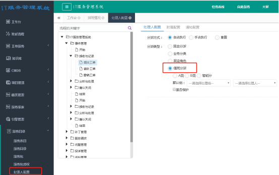 首先需要把排班設置好,在排班的地方分配好值班人員的崗位,如A崗或B崗;崗位設置好之后選擇處理人配置按值班分派,選擇崗位,提交的工單便可直接分配給當天值班人員。