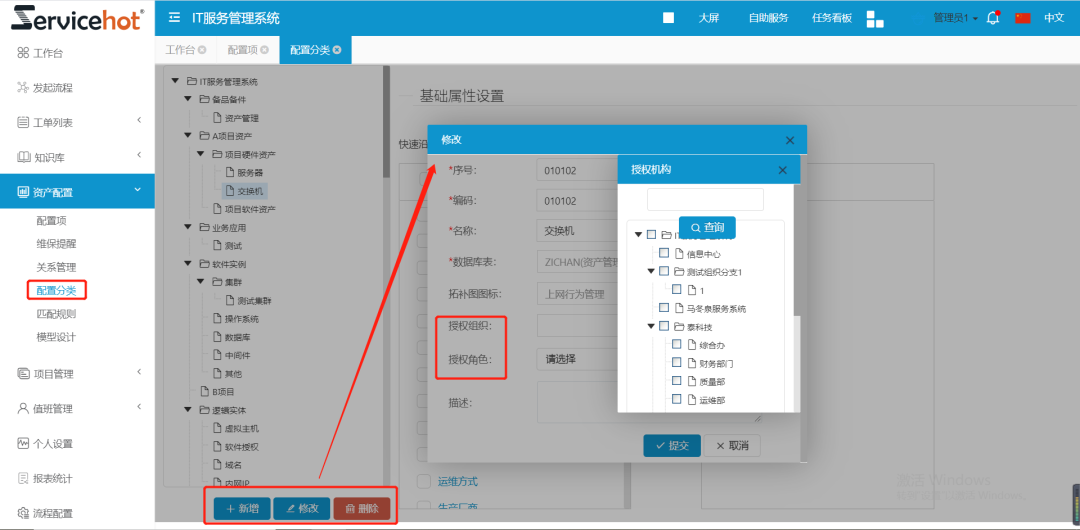 管理員可通過(guò)資產(chǎn)配置-配置分類對(duì)資產(chǎn)配置相應(yīng)的人員查看權(quán)限,可以選擇組織或角色進(jìn)行授權(quán)。