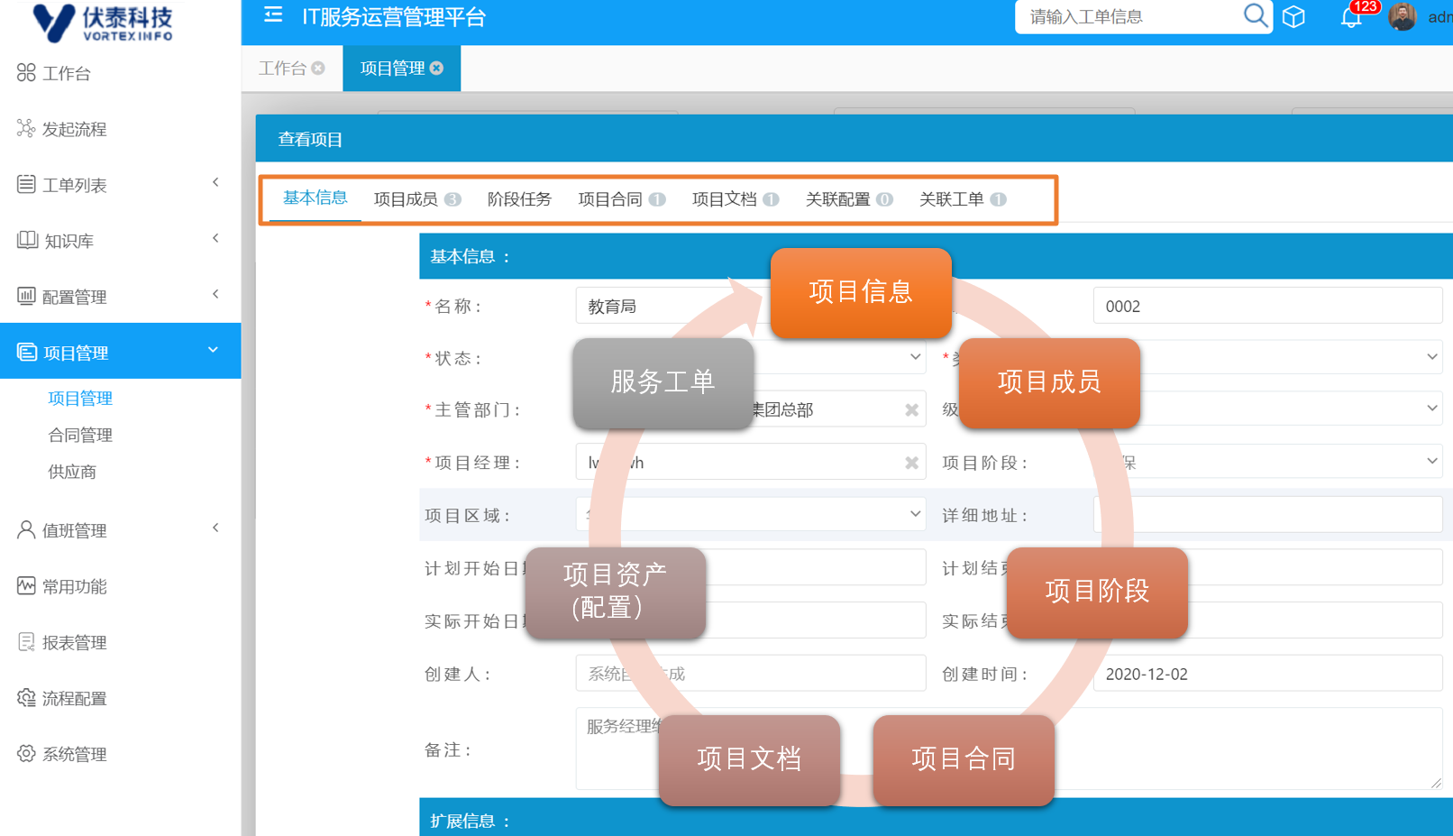 可管理項(xiàng)目的基本信息、項(xiàng)目成員、項(xiàng)目階段、項(xiàng)目合同、項(xiàng)目文檔,項(xiàng)目與流程的關(guān)聯(lián)性,項(xiàng)目與配置的關(guān)聯(lián)性,同時(shí)客戶可直接對(duì)項(xiàng)目進(jìn)行問題提報(bào),而不是通過傳統(tǒng)的業(yè)務(wù)分類。