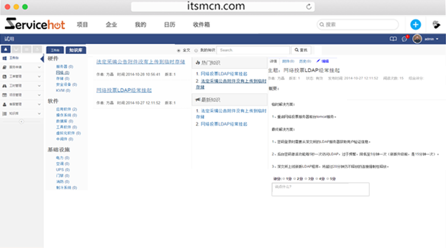 ServiceHot知識庫是一個解決方案的匯總,針對各種IT應用和設備故障現象,知識庫提供了系列行之有效的解決方案。知識庫引入了國際通用的WIKI平臺,除了知識庫管理者可以維護知識庫記錄外,任何使用者都可以添加個人的評論,各種評論都可以作為版本的一部分保留于知識庫中,通過使用者的評價和完善,后續使用者可以獲得更加完美的解決方案。